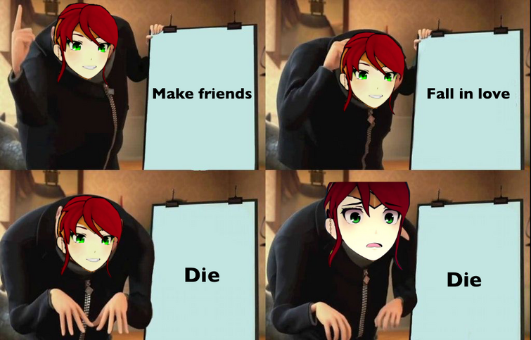 Explanation A fan-made comic began making the rounds at Knowyourmeme shortly after the Volume 3 ending went live depicting Ruby and the surviving members of team JNPR mourning Pyrrhas death with this being the punchline. Best pyrrha memes popular memes on the site ifunnyco. The only reason ruby goes to haven is because qrow told her his only lead is in haven.